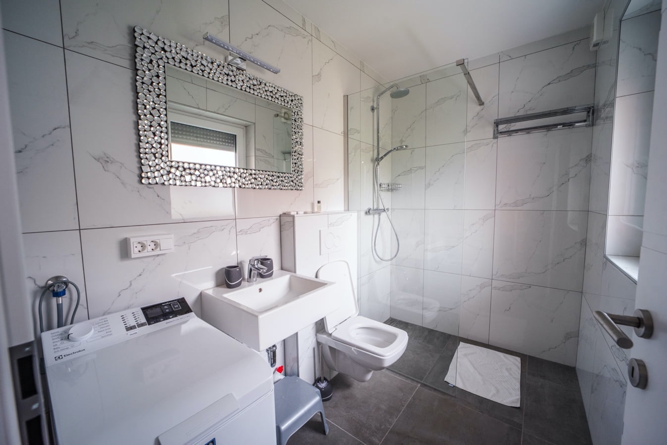 V hiški Villa Lara se nahajata dve kopalnici. Mala se nahaja v prostoru ob IR savni, velika pa je samostojna in se lahko pohvali z velikim prostorom za tuširanje, novim pralnim strojem, modernim umivalnikom in wc-jem ter sušilnikom za lase. Na voljo so tudi vedno sveže brisače. Kopalnica je moderno zasnovana, z estetsko keramiko in moderno opremo.